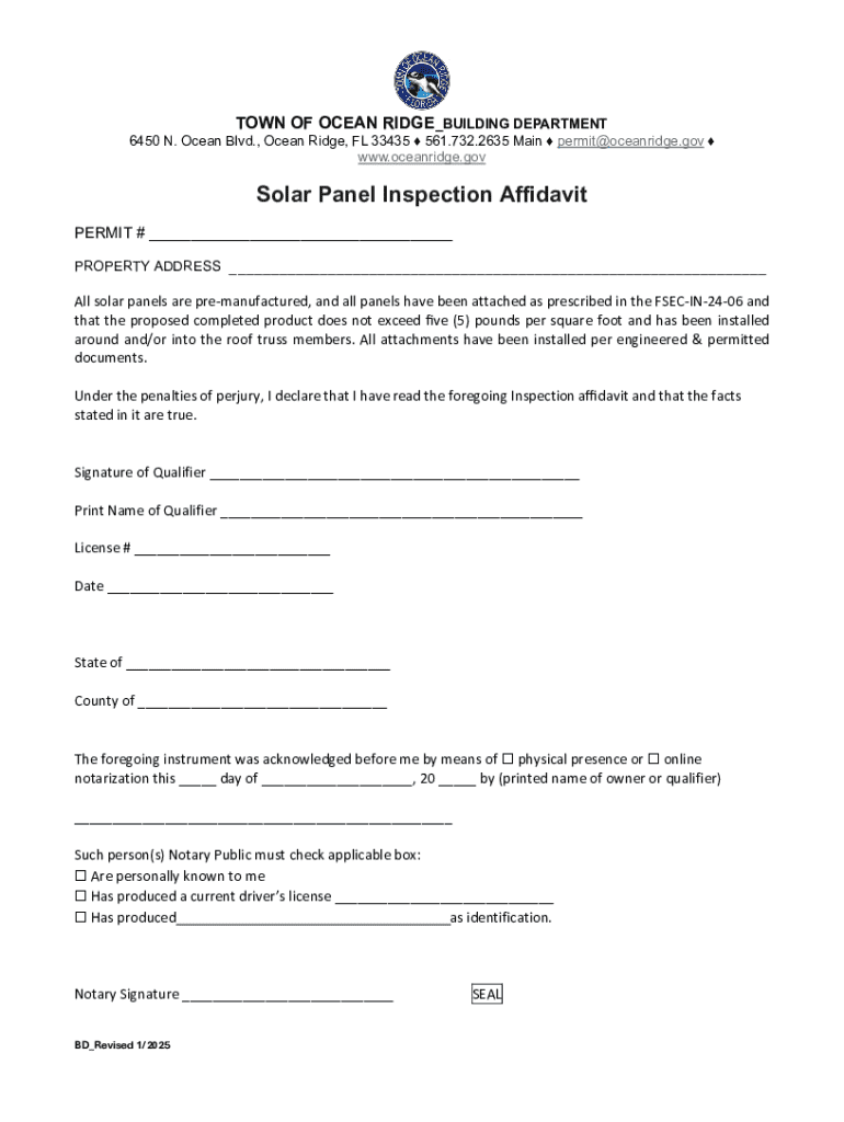 TOWN OF OCEAN RIDGE_BUILDING DEPARTMENT 6450 N. Ocean Blvd., Ocean Ridge, FL 33435 561.732.2635 Main permit@oceanridge.gov www.oceanridge.govSolar Panel Inspection Affidavit PERMIT # ___ PROPERTY