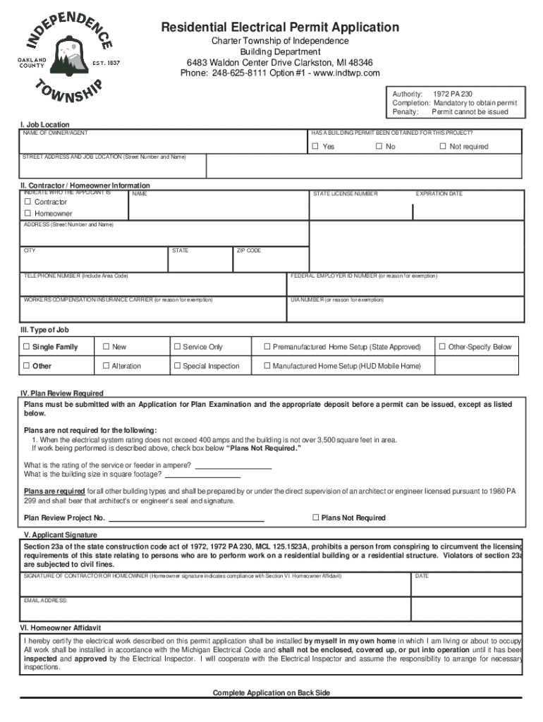 This document is a permit application required for obtaining a residential electrical permit in the Charter Township of Independence. It includes sections for job location, contractor/homeowner information, type of job, plan review requirements, applicant signature, and homeowner affidavit. The document also provides fee clarification and instructions for completing the application.