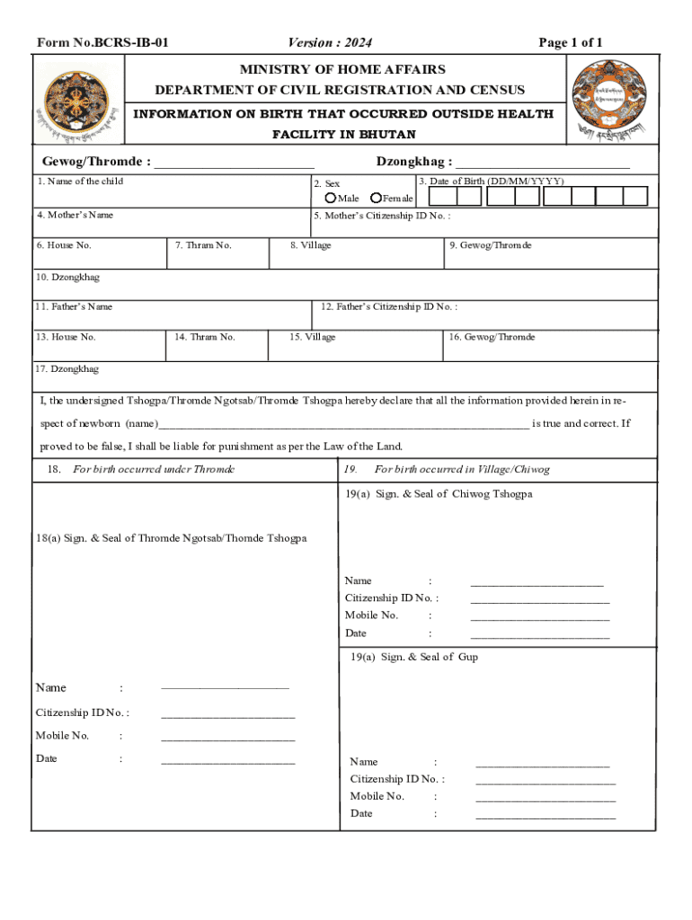 This form is used to register the birth of a child that occurred outside of a health facility in Bhutan, requiring details about the child, parents, and local administrative officials.