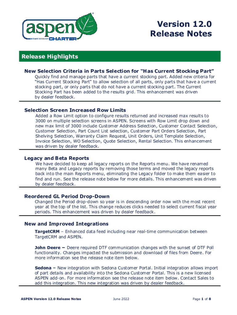Version 12.0 Release Notes Release Highlights New Selection Criteria in Parts Selection for Has Current Stocking PartQuickly find and manage parts that have a current stocking part. Added new criteria