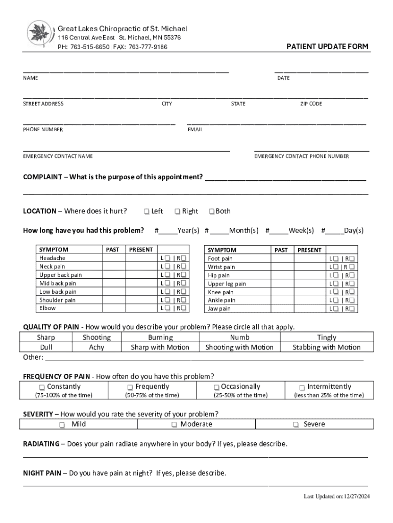 Great Lakes Chiropractic of St. Michael 116 Central Ave East St. Michael, MN 55376 PH: 7635156650 | FAX: 7637779186PATIENT UPDATE FORM______NAMEDATE___ STREET ADDRESSCITYSTATEZIP CODE______PHONE NUMBEREMAIL______EMERGENCY