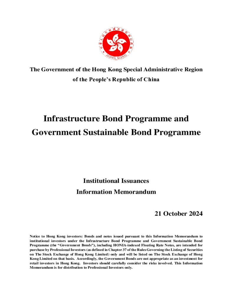 This Information Memorandum outlines the terms and conditions for bonds and notes to be issued to institutional investors under the Infrastructure Bond Programme and Government Sustainable Bond Programme by the Government of the Hong Kong Special Administrative Region.