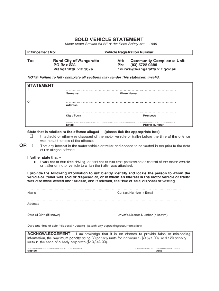 This statement is made under Section 84 BE of the Road Safety Act to declare the sale or disposal of a vehicle in relation to an alleged offence. It requires personal details of the declarant and information about the vehicle or trailer sold or disposed of.