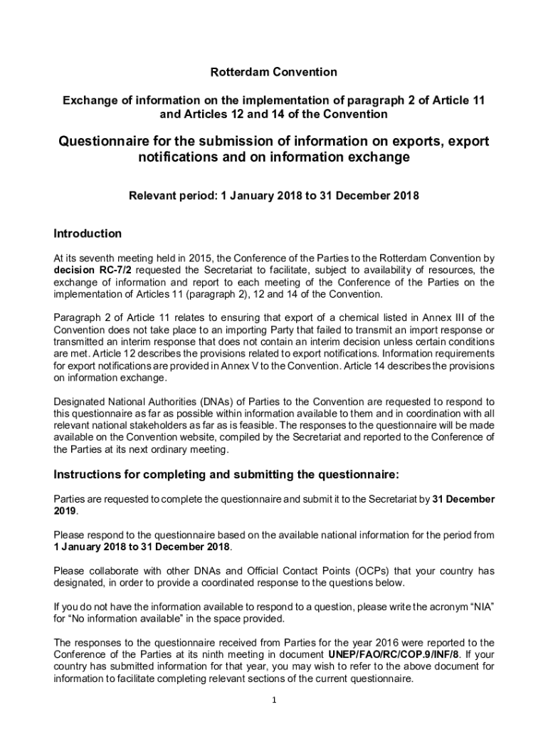 Rotterdam Convention Exchange of information on the implementation of paragraph 2 of Article 11 and Articles 12 and 14 of the ConventionQuestionnaire for the submission of information on exports,