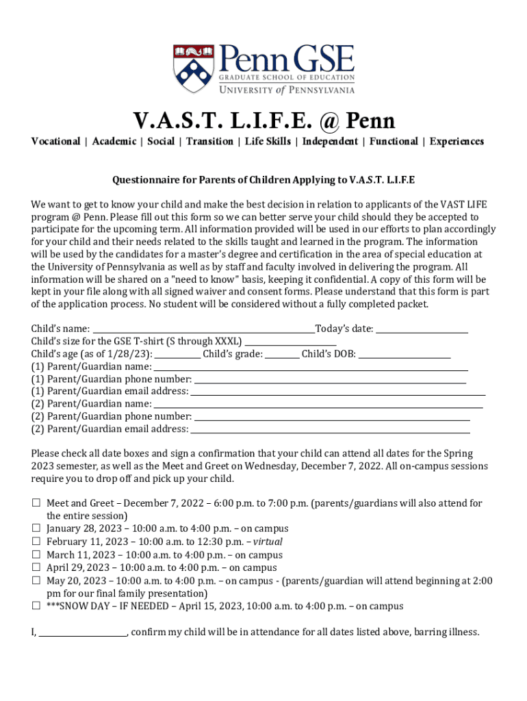 V.A.S.T. L.I.F.E. @ Penn Vocational | Academic | Social | Transition | Life Skills | Independent | Functional | Experiences Questionnaire for Parents of Children Applying to V.A.S.T. L.I.F.E We want