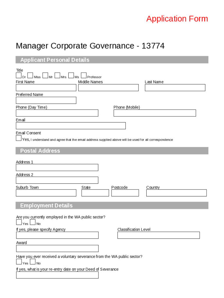This form is used to collect personal details from applicants applying for the Manager Corporate Governance position. It includes sections for personal contact information, employment details, and consent for email correspondence.
