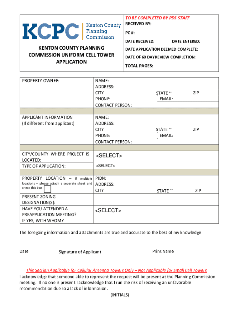 TO BE COMPLETED BY PDS STAFF RECEIVED BY: PC #:KENTON COUNTY PLANNING COMMISSION UNIFORM CELL TOWER APPLICATION PROPERTY OWNER:DATE RECEIVED:DATE APPLICATION DEEMED COMPLETE: DATE OF 60 DAY REVIEW
