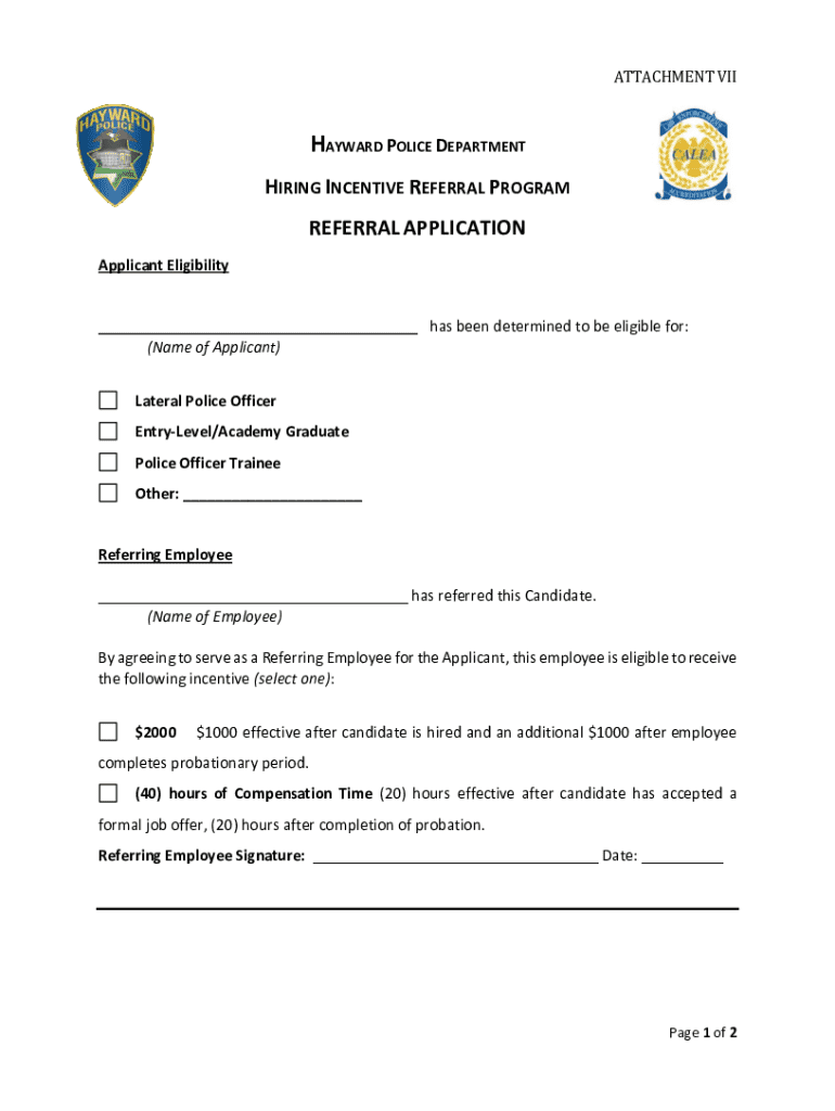 ATTACHMENT VIIHAYWARD POLICE DEPARTMENT HIRING INCENTIVE REFERRAL PROGRAM REFERRAL APPLICATION Applicant Eligibilityhas been determined to be eligible for: (Name of Applicant) Lateral Police Officer
