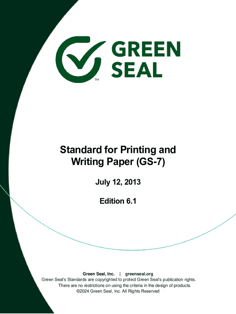 Standard for Printing and Writing Paper (GS7) July 12, 2013 Edition 6.1Green Seal, Inc. | greenseal.org Green Seals Standards are copyrighted to protect Green Seals publication rights. There are no