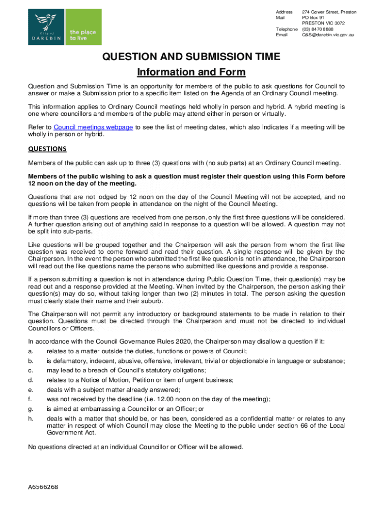 This form allows members of the public to submit questions or make a submission regarding items on the agenda for Ordinary Council meetings. It includes instructions on how to ask questions or make submissions and outlines the relevant procedures to follow.