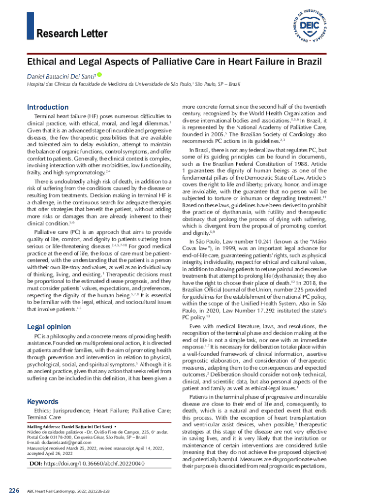 Este artigo aborda os dilemas éticos, legais e morais associados aos cuidados paliativos em pacientes com insuficiência cardíaca terminal no Brasil. Discute a importância de uma abordagem centrada no paciente e a necessidade de respeitar a dignidade e as preferências dos pacientes no final de suas vidas. O artigo menciona as lacunas na legislação e as recomendações para garantir cuidados de qualidade durante as fases terminais da doença.