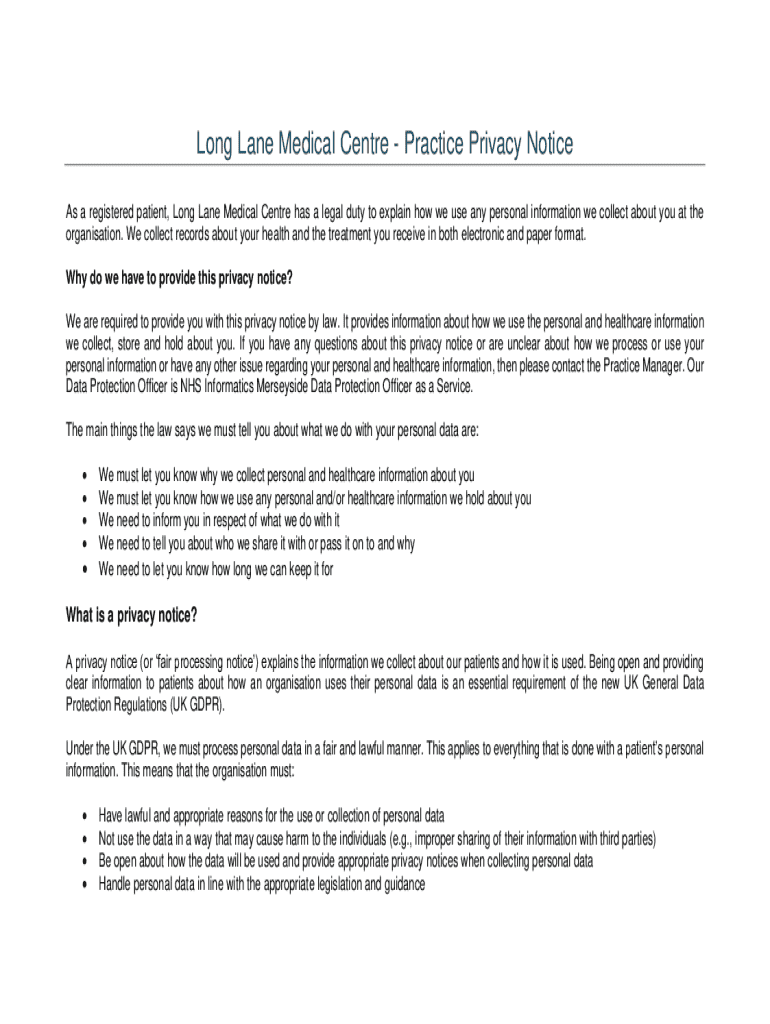 Long Lane Medical Centre Practice Privacy Notice As a registered patient, Long Lane Medical Centre has a legal duty to explain how we use any personal information we collect about you at the organisation.