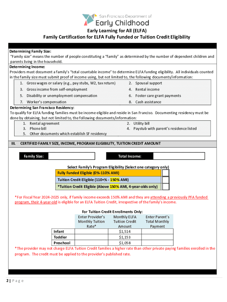 Este formulario se utiliza para certificar la elegibilidad de las familias para programas financiados totalmente o con crédito de matrícula bajo el programa Early Learning for All (ELFA) en San Francisco. Se debe determinar la priorización de inscripción, validar la elegibilidad económica y la residencia, así como recoger información familiar.