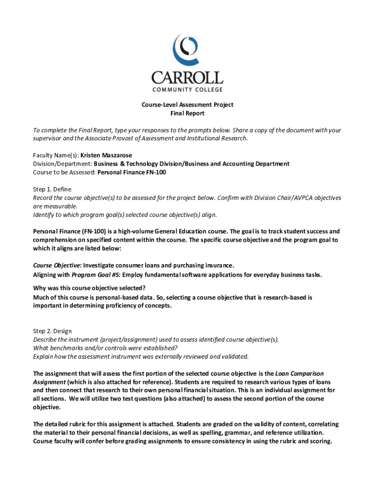 CARROLL COMMUNITY COLLEGECourseLevel Assessment Project Final Report To complete the Final Report, type your responses to the prompts below. Share a copy of the document with your supervisor and the
