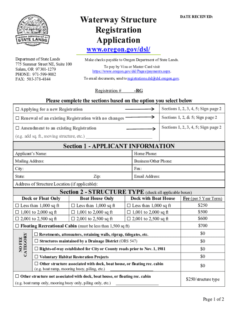 This application form is used for registering new waterway structures, renewing existing registrations, or amending current registrations in compliance with local, state, and federal laws as administered by the Oregon Department of State Lands.