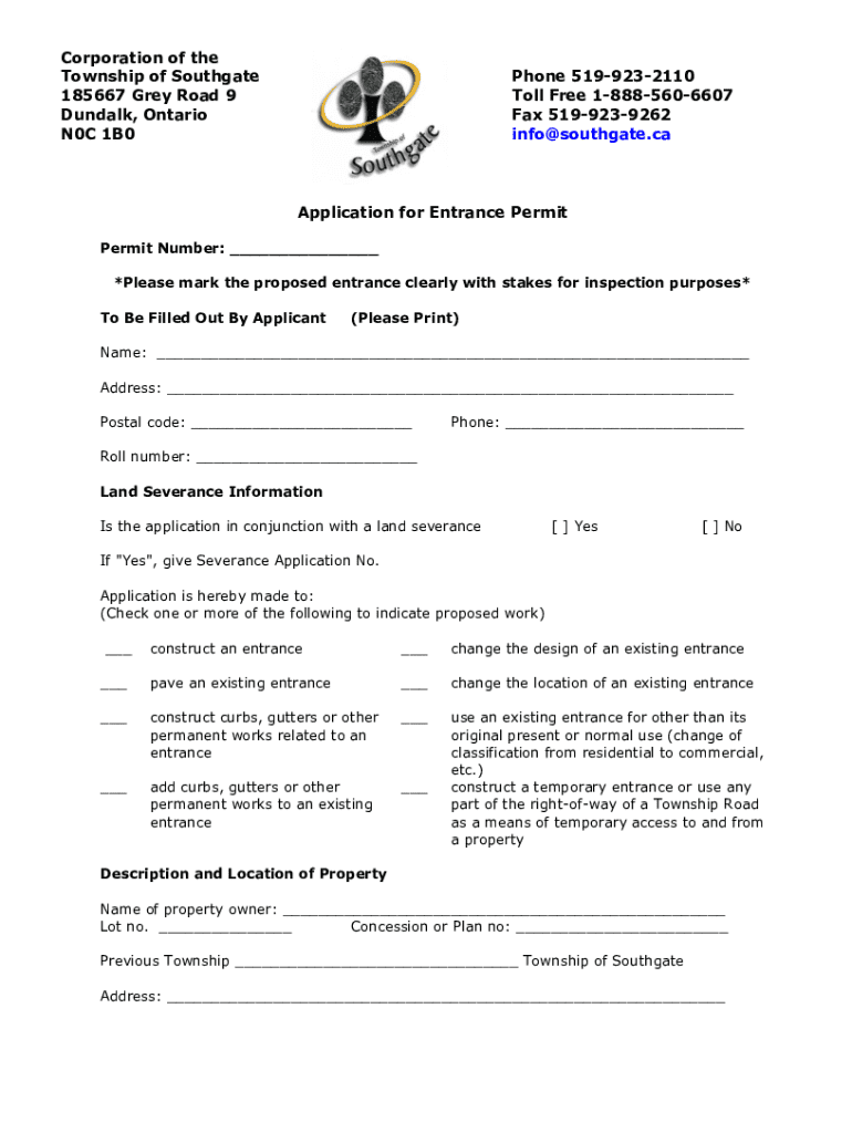 This form is to be completed by applicants who wish to apply for an entrance permit from the Township of Southgate. It includes sections for personal information, land severance information, purpose of the entrance, and required fees. The permit is subject to municipal by-laws and specific conditions regarding construction and maintenance of the entrance.