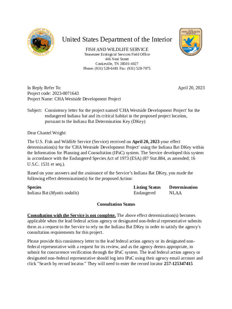 This letter outlines the consistency determination for the CHA Westside Development Project concerning the endangered Indiana bat and its critical habitat. It includes project details, relevant species, and next steps for consultation.