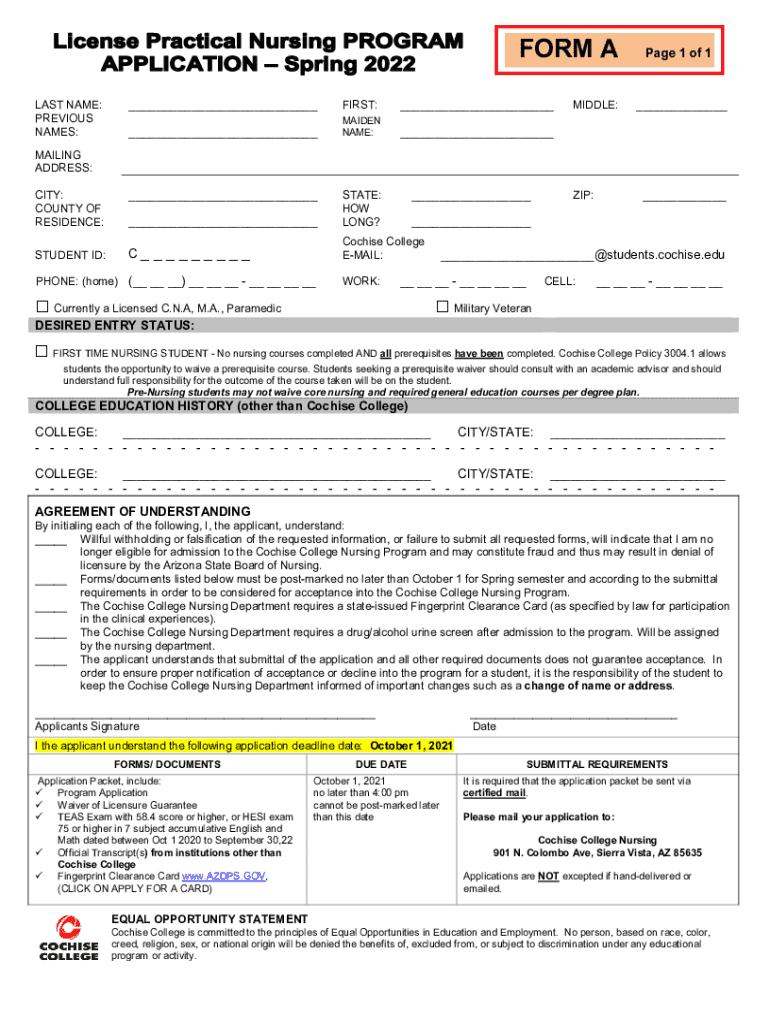 FORM A LAST NAME: PREVIOUS NAMES:___FIRST:______MAIDEN NAME:___MIDDLE:Page 1 of 1___MAILING ADDRESS: CITY: COUNTY OF RESIDENCE:___ ___STATE: HOW LONG?STUDENT ID:C_Cochise College EMAIL:___PHONE: (home)