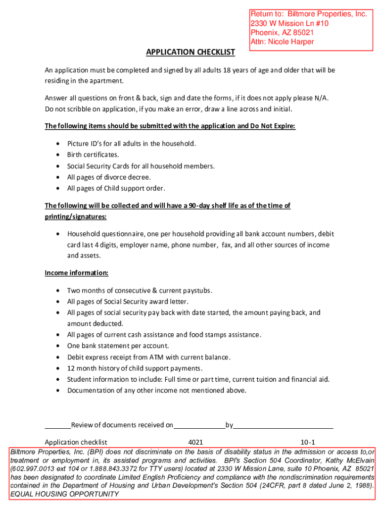 Return to: Biltmore Properties, Inc. 2330 W Mission Ln #10 Phoenix, AZ 85021 Attn: Nicole HarperAPPLICATION CHECKLIST An application must be completed and signed by all adults 18 years of age and