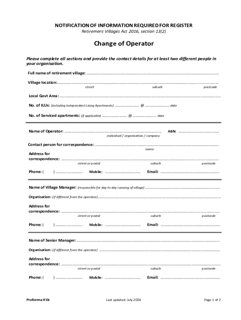 This form is used to notify the relevant authorities of a change in the operator of a retirement village as per the Retirement Villages Act 2016, section 13(2). It requires detailed information about the village, operators, and contact persons.