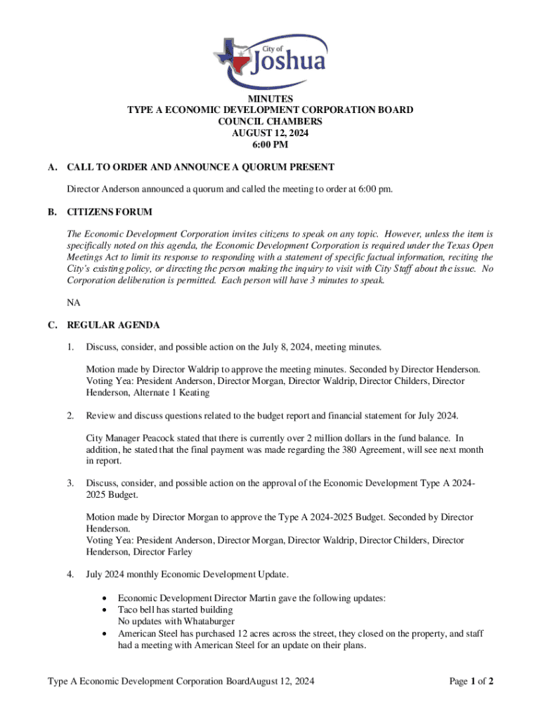 These minutes document the proceedings of the Type A Economic Development Corporation Board meeting held on August 12, 2024, including discussions on meeting minutes approval, budget reports, economic updates, and an executive session.
