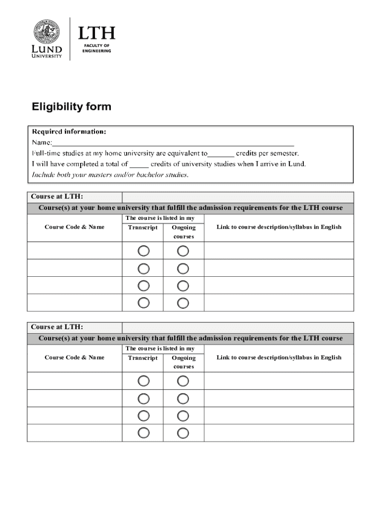 This form collects information regarding the eligibility of students for courses at Lund University, including credit equivalencies and ongoing courses.
