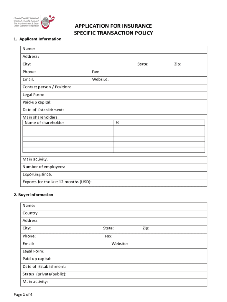 This document serves as an application for insurance coverage related to a specific transaction policy. It requires detailed information about the applicant, buyer, and the contract associated with