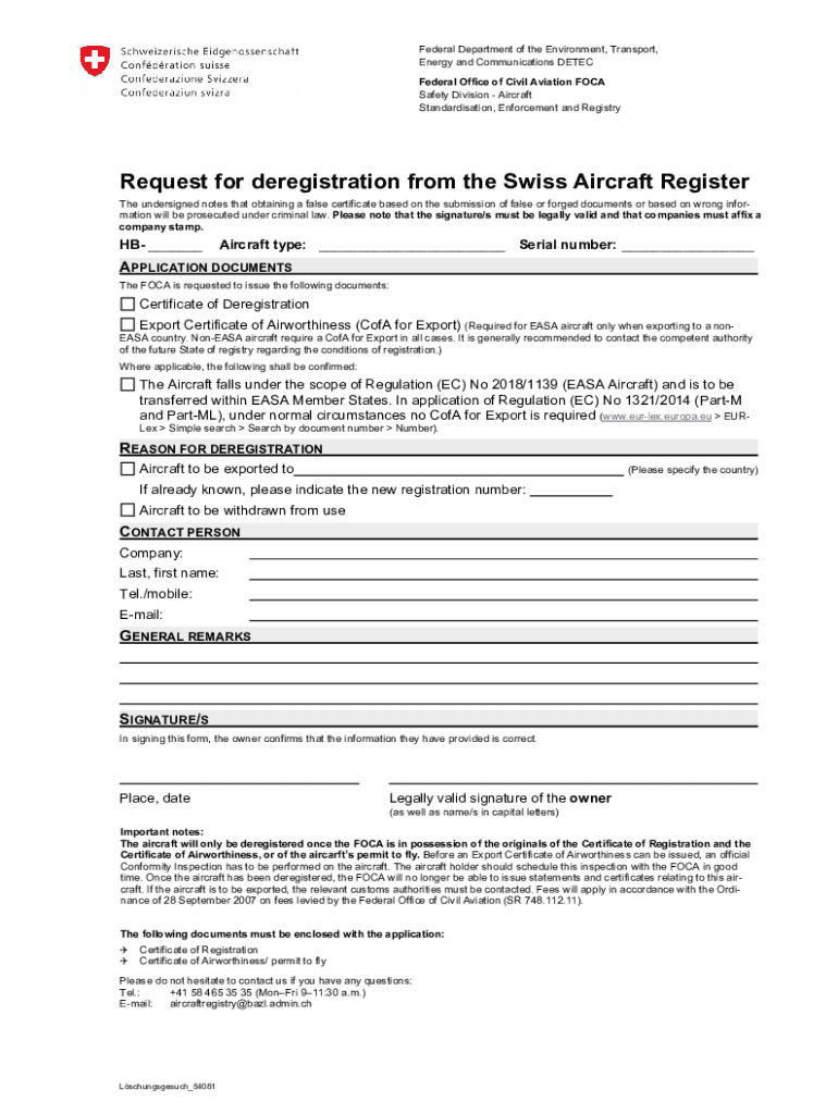 This form is a request for deregistration from the Swiss Aircraft Register, including details about the aircraft, necessary documentation, and conditions for deregistration.