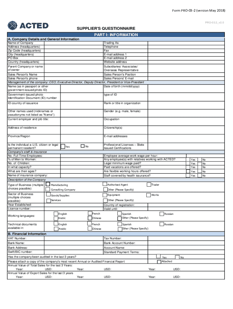 This form collects detailed information about suppliers, including company details, financial information, experience, technical capability, and miscellaneous certifications to assess qualifications for partnership with ACTED.