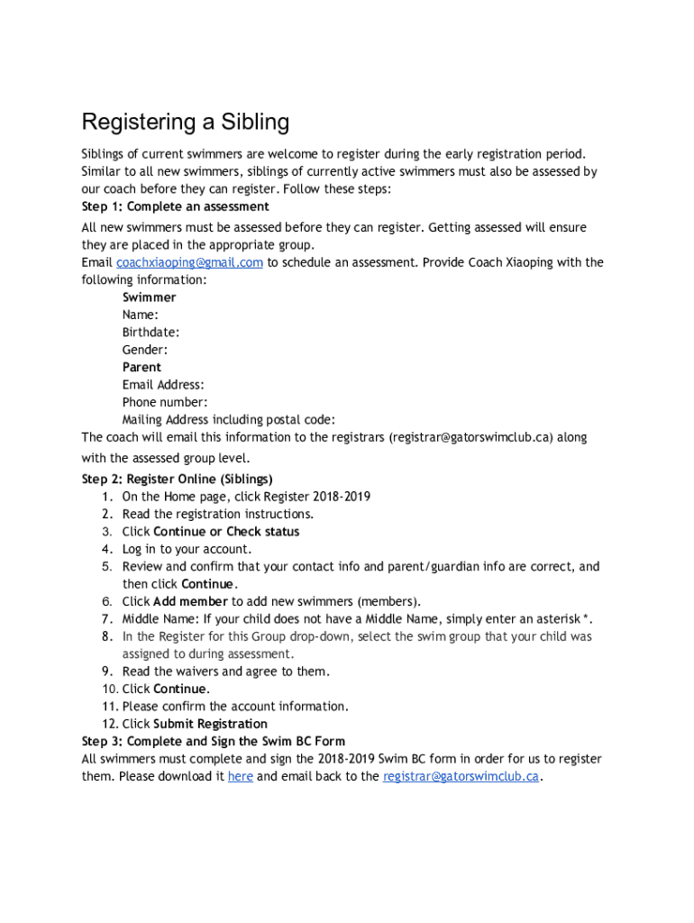 Registering a Sibling Siblings of current swimmers are welcome to register during the early registration period. Similar to all new swimmers, siblings of currently active swimmers must also be assessed