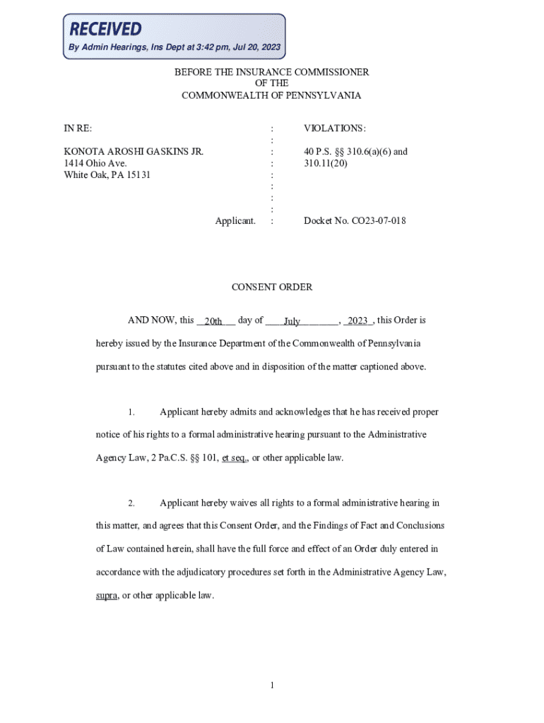 By Admin Hearings, Ins Dept at 3:42 pm, Jul 20, 2023BEFORE THE INSURANCE COMMISSIONER OF THE COMMONWEALTH OF PENNSYLVANIA IN RE: KONOTA AROSHI GASKINS JR. 1414 Ohio Ave. White Oak, PA 15131Applicant.: