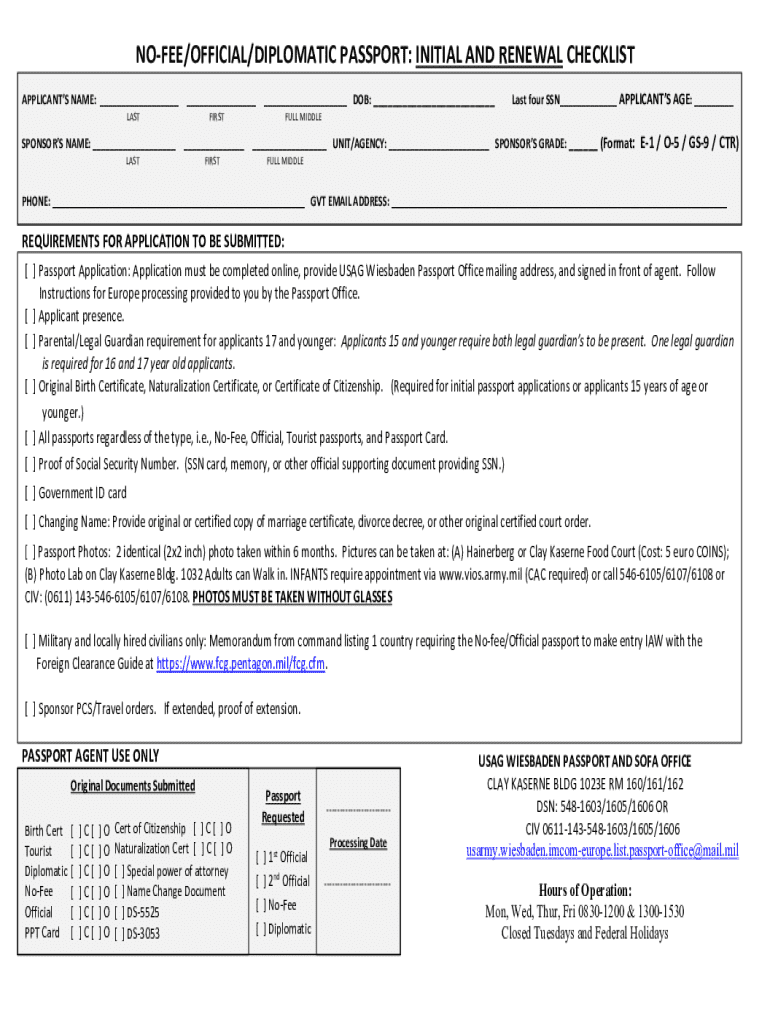 This checklist outlines the requirements and steps necessary for applying for or renewing a No-Fee, Official, or Diplomatic Passport, including applicant information, sponsor details, and necessary documentation.