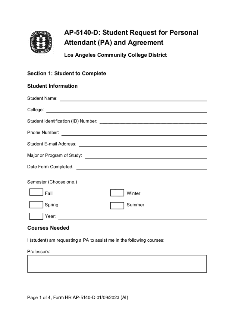 AP5140D: Student Request for Personal Attendant (PA) and Agreement Los Angeles Community College District Section 1: Student to Complete Student Information Student Name: College: Student Identification