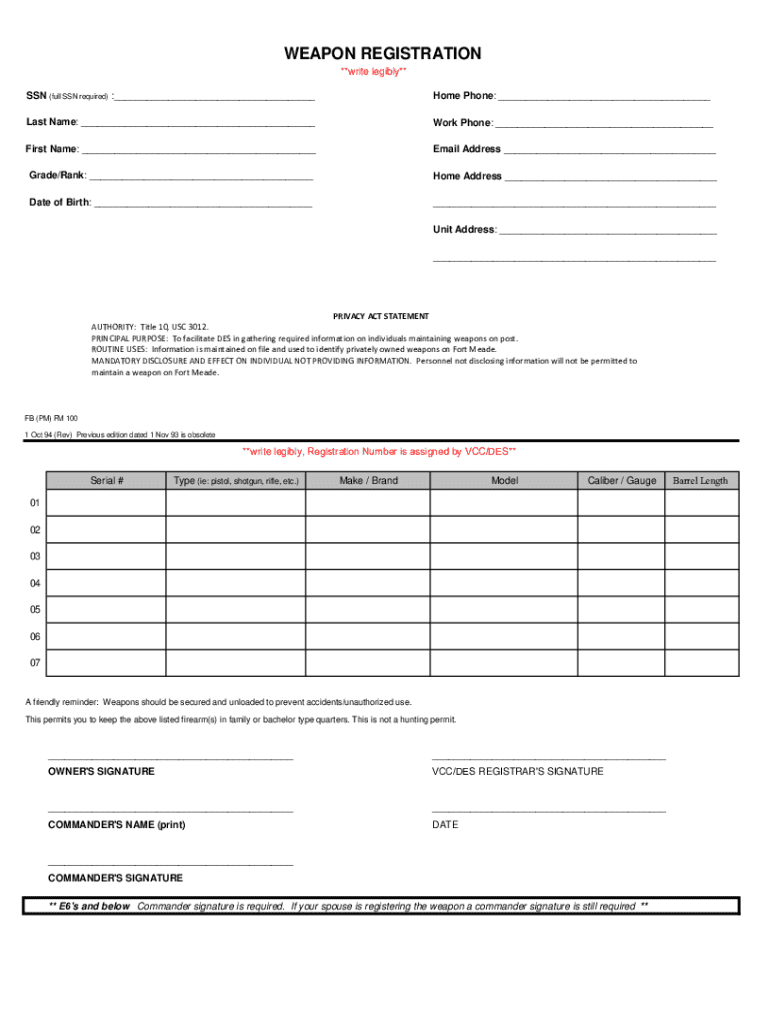 WEAPON REGISTRATION **write legibly** SSN (full SSN required) :___Home Phone: ___Last Name: ___Work Phone: ___First Name: ___Email Address ___Grade/Rank: ___Home Address ___Date of Birth: ______ Unit