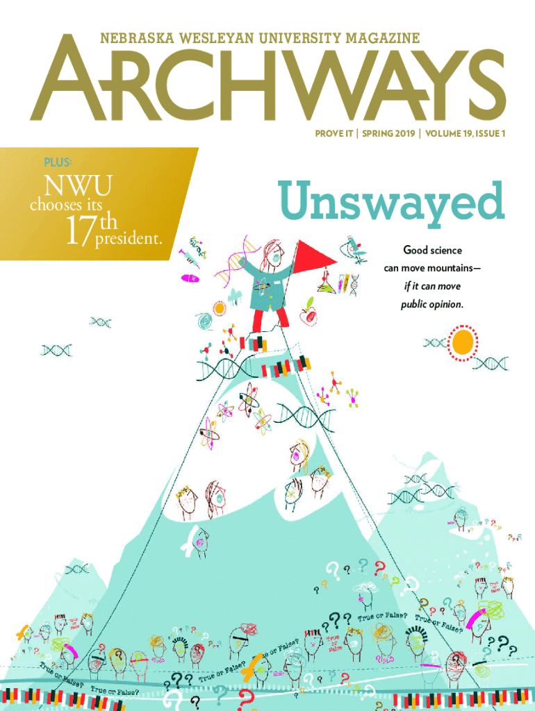 NEBRASKA WESLEYAN UNIVERSITY MAGAZINEPROVE IT | SPRING 2019PLUS:NWU chooses its17president. th| VOLUME 19, ISSUE 1Unswayed Good science can move mountains if it can move public opinion.FROM THE PRESIDENT