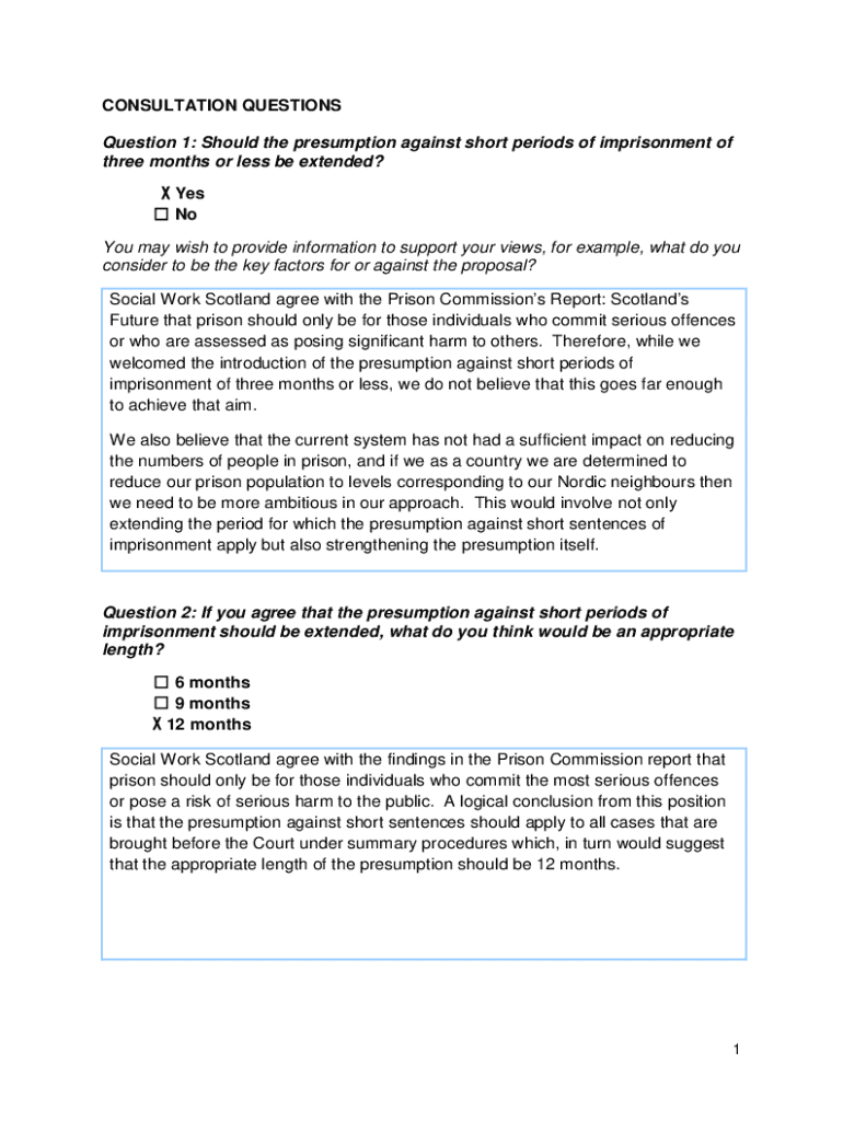 This document consists of a series of consultation questions intended to gather opinions on the presumption against short periods of imprisonment, as well as to discuss the implications and necessary considerations for sentencing in the Scottish justice system.