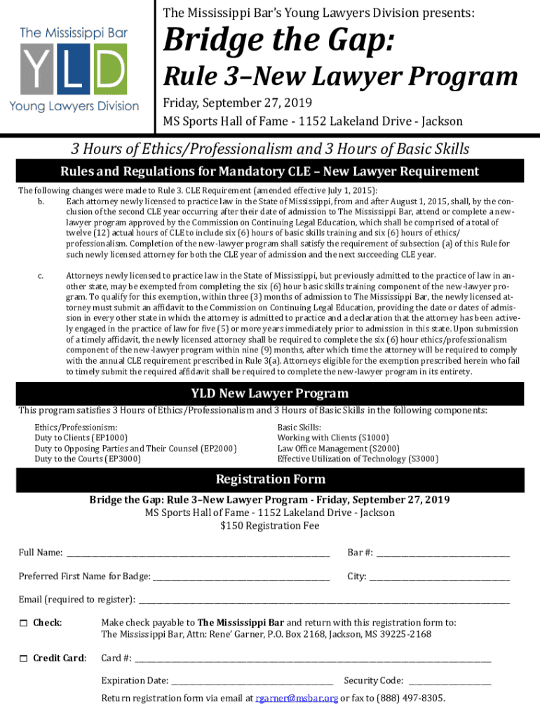 The Mississippi Bars Young Lawyers Division presents:Bridge the Gap:Rule 3New Lawyer Program Friday, September 27, 2019 MS Sports Hall of Fame 1152 Lakeland Drive Jackson3 Hours of Ethics/Professionalism