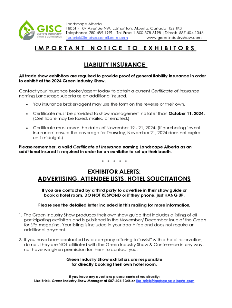 Landscape Alberta 18051 107 Avenue NW, Edmonton, Alberta, Canada T5S 1K3 Telephone: 7804891991 | Toll Free: 18003783198 | Direct: 5874041346 lisa.brick@landscapealberta.com www.greenindustryshow.comIMPORTANT