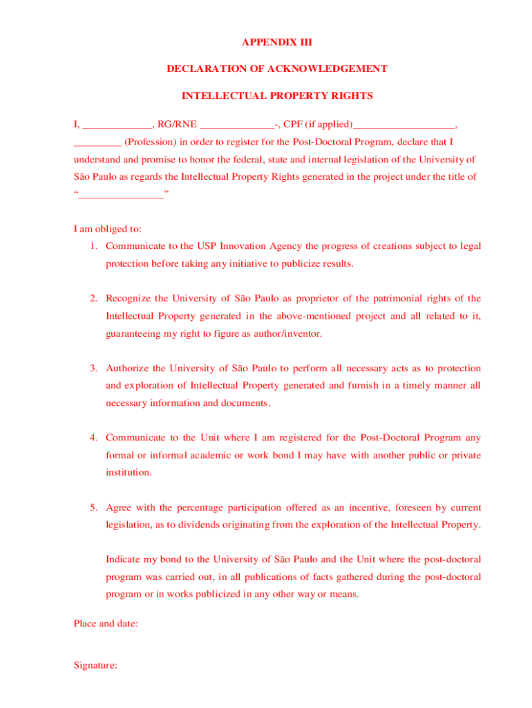 APPENDIX III DECLARATION OF ACKNOWLEDGEMENT INTELLECTUAL PROPERTY RIGHTS I, ___, RG/RNE ___, CPF (if applied)___, ___ (Profession) in order to register for the PostDoctoral Program, declare that I