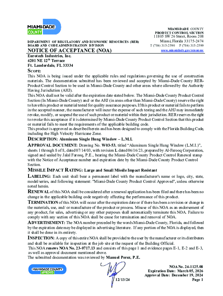 MIAMIDADE COUNTY PRODUCT CONTROL SECTIONDEPARTMENT OF REGULATORY AND ECONOMIC RESOURCES (RER) BOARD AND CODE ADMINISTRATION DIVISIONNOTICE OF ACCEPTANCE (NOA)11805 SW 26 Street, Room 208 Miami, Florida