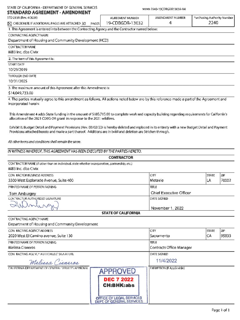 STATE OF CALIFORNIA DEPARTMENT OF GENERAL SERVICESsco ID: 224019CDBGDR13032A4STANDARD AGREEMENT AMENDMENT STD 213A (Rev. 4/2020) CHECK HERE IF ADDITIONAL PAGES ARE ATTACHED30PAGESAGREEMENT NUMBERAMENDMENT