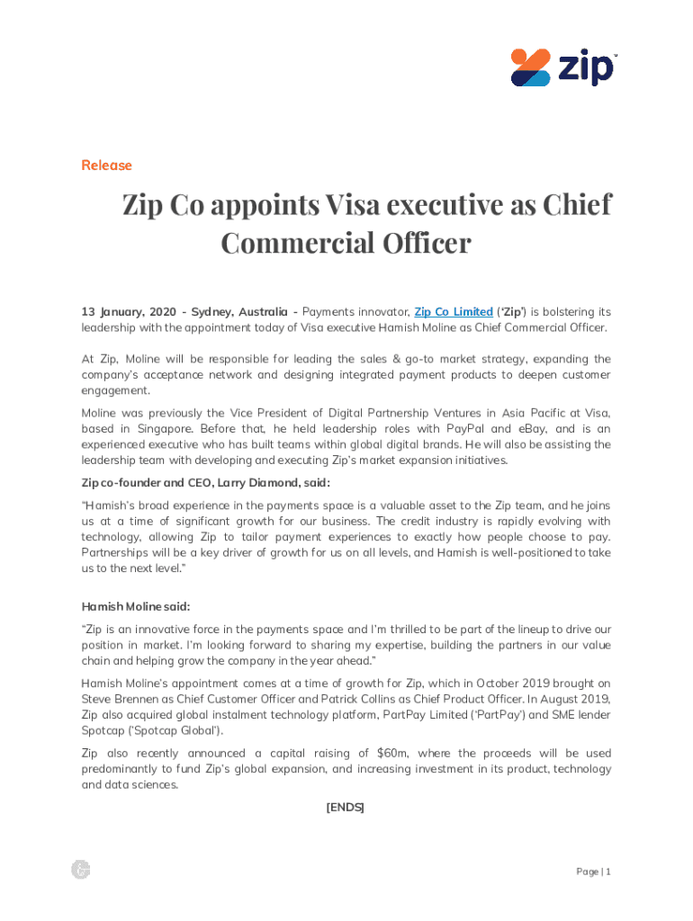 ReleaseZip Co appoints Visa executive as Chief Commercial Officer 13 January, 2020 Sydney, Australia Payments innovator, Zip Co Limited (Zip) is bolstering its leadership with the appointment today