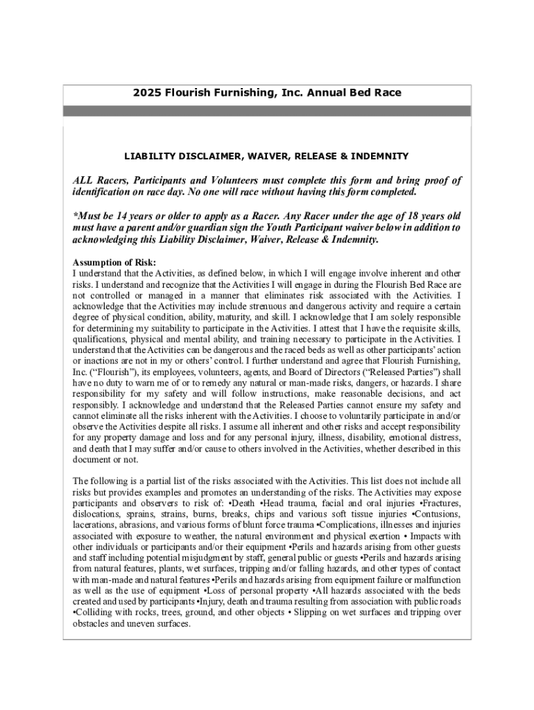 2025 Flourish Furnishing, Inc. Annual Bed RaceLIABILITY DISCLAIMER, WAIVER, RELEASE & INDEMNITYALL Racers, Participants and Volunteers must complete this form and bring proof of identification on