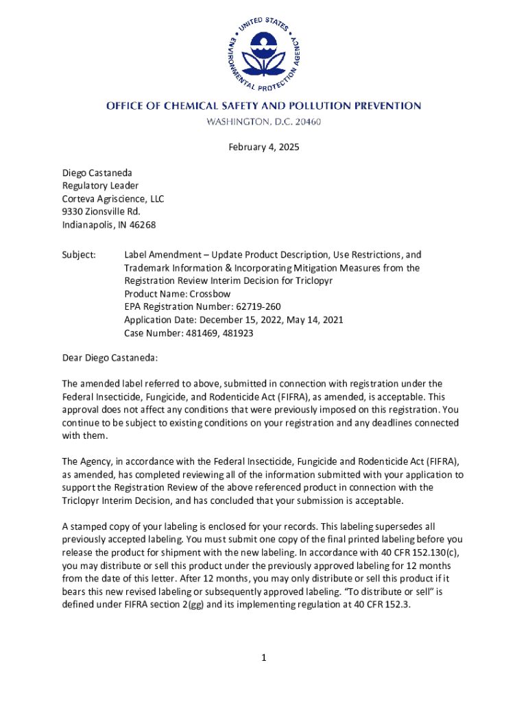 February 4, 2025 Diego Castaneda Regulatory Leader Corteva Agriscience, LLC 9330 Zionsville Rd. Indianapolis, IN 46268 Subject:Label Amendment Update Product Description, Use Restrictions, and Trademark