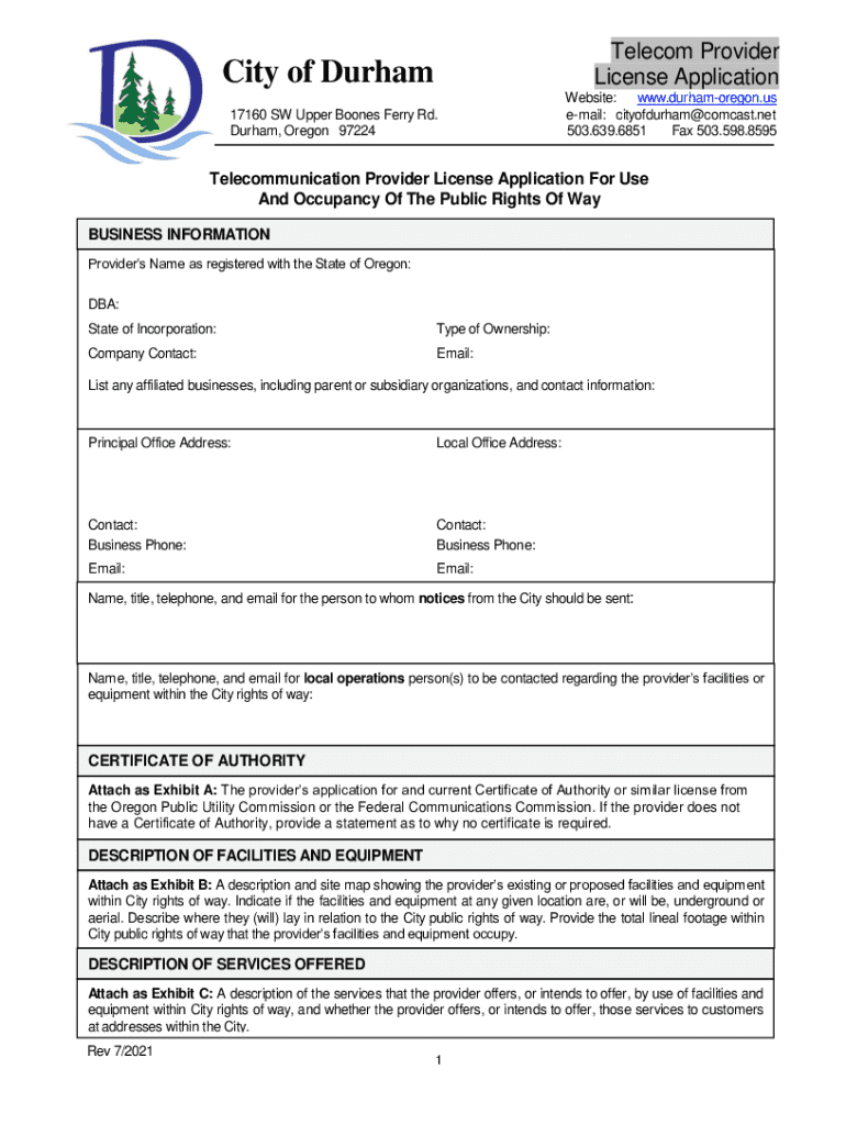 Este formulario es una solicitud para obtener una licencia de proveedor de telecomunicaciones para el uso y ocupación de los derechos de paso públicos en la ciudad de Durham, Oregon.