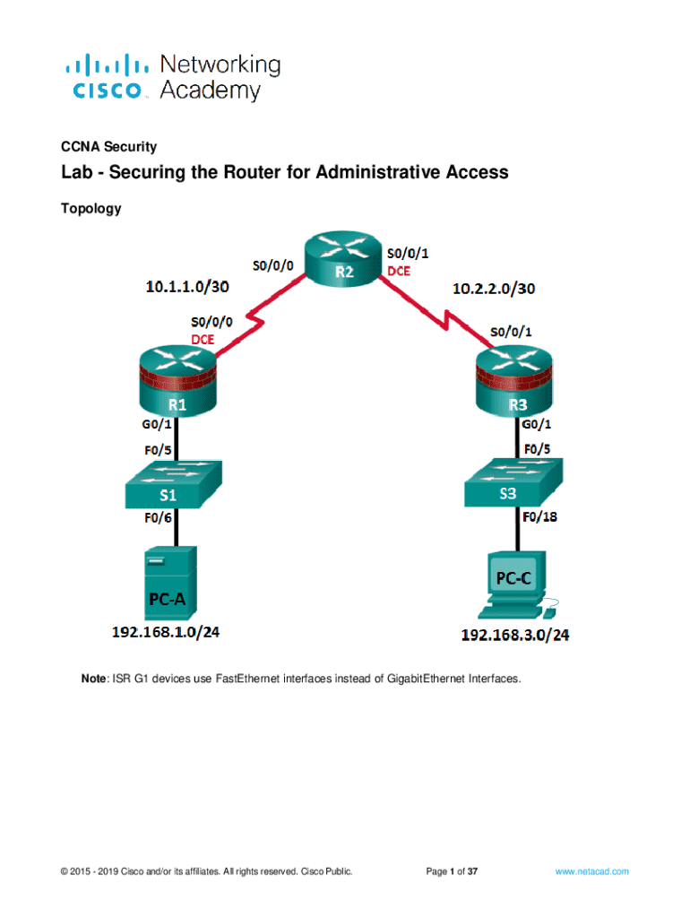 CCNA SecurityLab Securing the Router for Administrative Access TopologyNote: ISR G1 devices use FastEthernet interfaces instead of GigabitEthernet Interfaces. 2015 2019 Cisco and/or its affiliates.
