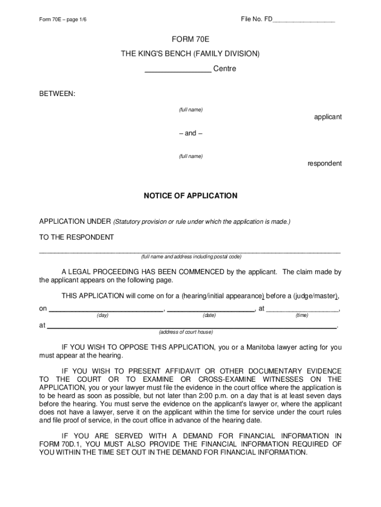 Form 70E page 1/6File No. FD___FORM 70E THE KING\'S BENCH (FAMILY DIVISION) ___ Centre BETWEEN: (full name)applicant and (full name)respondentNOTICE OF APPLICATION APPLICATION UNDER (Statutory provision
