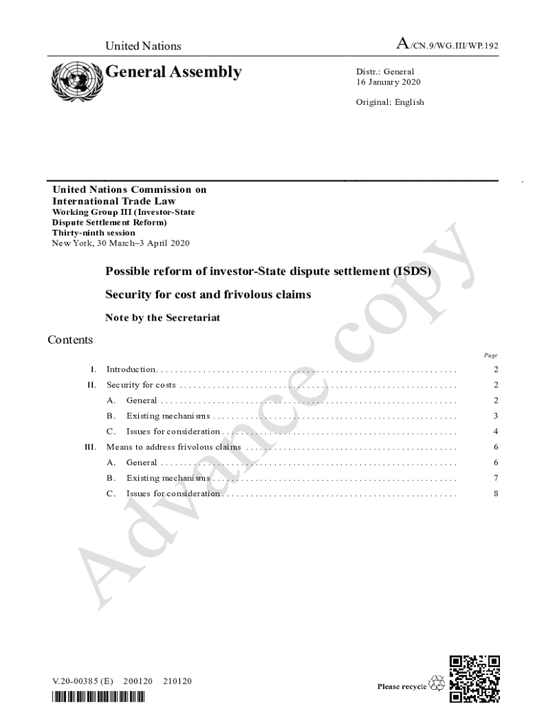 United NationsGeneral AssemblyA/CN.9/WG.III/WP.192 Distr.: General 16 January 2020 Original: EnglishUnited Nations Commission on International Trade Law Working Group III (InvestorState Dispute Settlement