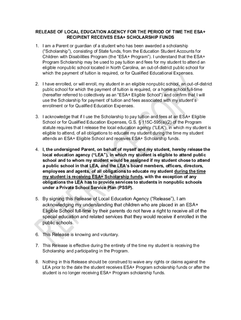 RELEASE OF LOCAL EDUCATION AGENCY FOR THE PERIOD OF TIME THE ESA+ RECIPIENT RECEIVES ESA+ SCHOLARSHIP FUNDS 1. I am a Parent or guardian of a student who has been awarded a scholarship (Scholarship),
