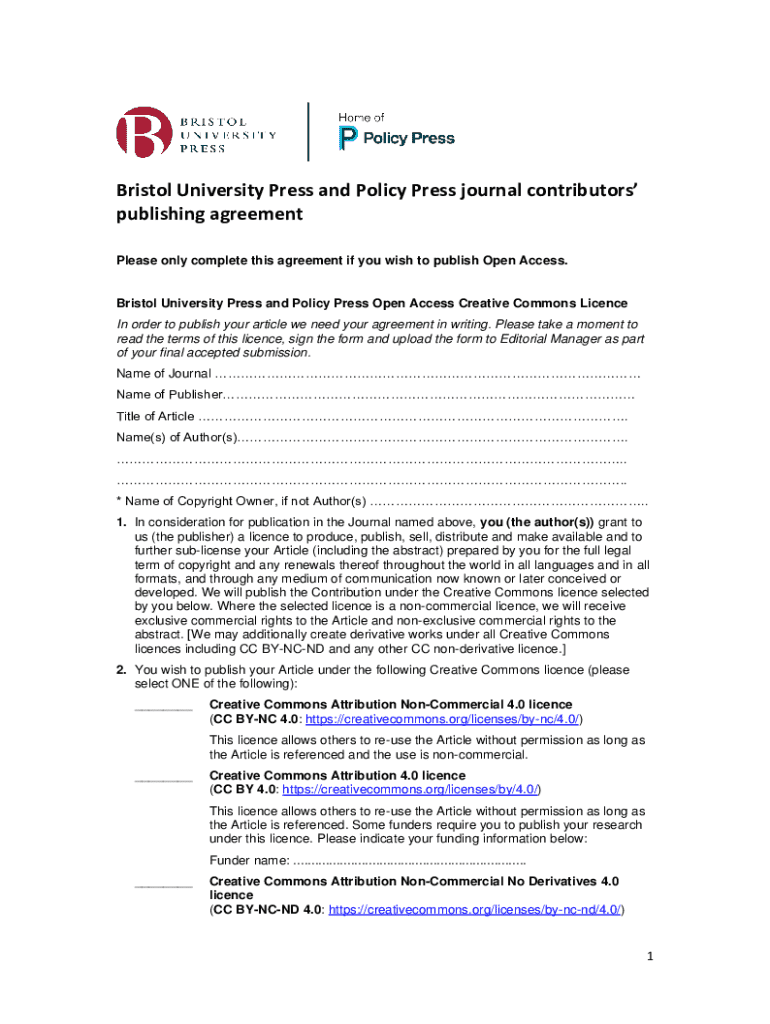 Bristol University Press and Policy Press journal contributors publishing agreement Please only complete this agreement if you wish to publish Open Access.Bristol University Press and Policy Press